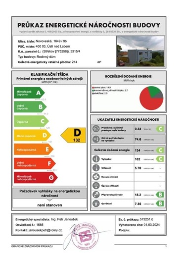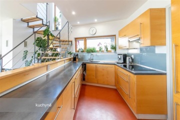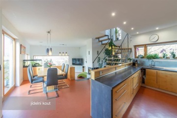 Představuji k prodeji rodinný dům 5+kk s velkou terasou s nádherným výhledem v Ústí nad Labem v části Střekov v ulici Novoveská 1649/9b. Podívejte se na samostatnou stránku bytu viz odkaz ve videoprohlídce. Dům, dokončený v roce 2010 podle návrhu renomovaných architektů z kanceláře 3+1 architekti, v sobě nese jedinečné kouzlo tohoto místa. Architekti s precizností využili fantastický výhled a dosáhli maximálního soukromí, čímž vytvořili jedinečný celek. Každý detail návrhu byl pečlivě promyšlen s ohledem na výhody tohoto ojedinělého místa. Skutečná krása však vynikne až v momentu, kdy se pohodlně usadíte v křesle, za vámi praská dřevo v krbu, a před vámi se otevírá úchvatný pohled do údolí s horizontem zdobeným pásy Krušných hor (31architekti). Pozemek, na kterém dům stojí má rozlohu 1.272 m2, je severojižně orientovaný a pečlivě udržovaný. Dispozice domu Obytná část domu je o dispozici 5+kk, užitná plocha je 176 m2, dům není podsklepený. Má dvě nadzemní podlaží a garáž pro jeden automobil. Prostorná terasa 30 m2, která zajištuje naprosté soukromí má navíc plachtové stínění proti západnímu slunci. Dům se prodává částečně zařízený, nastěhování je možné dle dohody. Technické informace • Dům je napojen na inženýrské sítě (obecní vodovod, elektřina) • Kanalizace je tlaková s objemem 1,3 m3 • Dešťová voda je svedena do zásobníku (12 m3), součástí je i čerpadlo • Vytápění zajištěno plynovým kotlem v kombinaci s teplovodním podlahovým vytápěním v 1. NP + koupelna a WC ve 2. NP • Dům je vybaven klimatizací • V obývacím prostoru je trojstěnný krb s vyvložkovaným komínem • Teplá voda je zajištěna v kombinovaném plynovém kotli • Elektřina 230/400 (měď) • Rozvod datových sítí je do každé místnosti • Stavba je realizovaná systémem „two by four“ – dřevěná konstrukce + ocelové výztuže, tloušťka stěn je 31 cm (minerální izolace 140 mm + 100 mm) • Schodiště je ocelové s dřevěnými schodnicemi • Okna dřevěná Meranti, dvojskla • Okna na slunečné části domu je možné zastínit venkovními žaluziemi • Střecha je kryta folií • Podlahy jsou anhydridové • V každém patře je koupelna, navíc je zde i užitečný shoz prádla do technické místnosti Pro prodej domu zajistím kompletní realitní a právní servis, případně financování hypotečním úvěrem. Kontaktujte mě prosím pro domluvení prohlídky: Michal Kovařík TAURUM reality s.r.o. Uvedené výměry jsou orientační